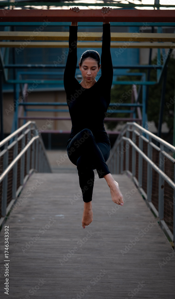 Woman dancer performing aerial yoga on urban bridge