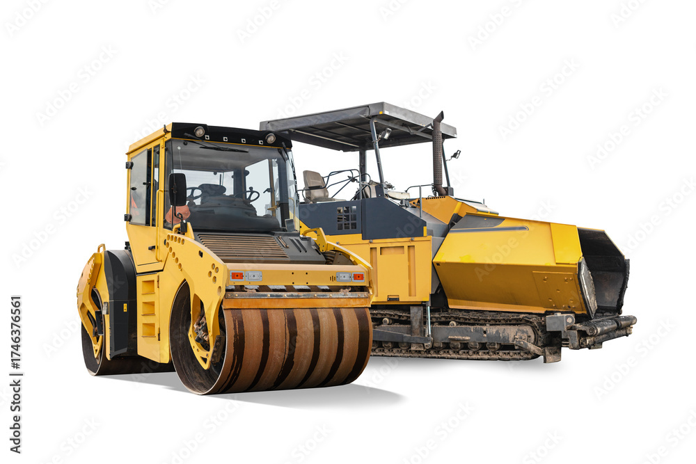 Asphalt paver and roller for paving roads in an isolated location. Road repair and construction. Construction equipment rental for major projects.