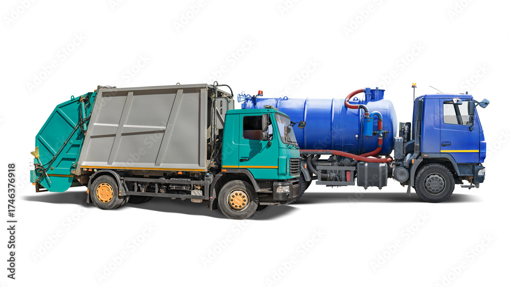 Two vehicles used for waste management are shown together, one for garbage collection and the other for vacuuming debris, highlighting their unique features.