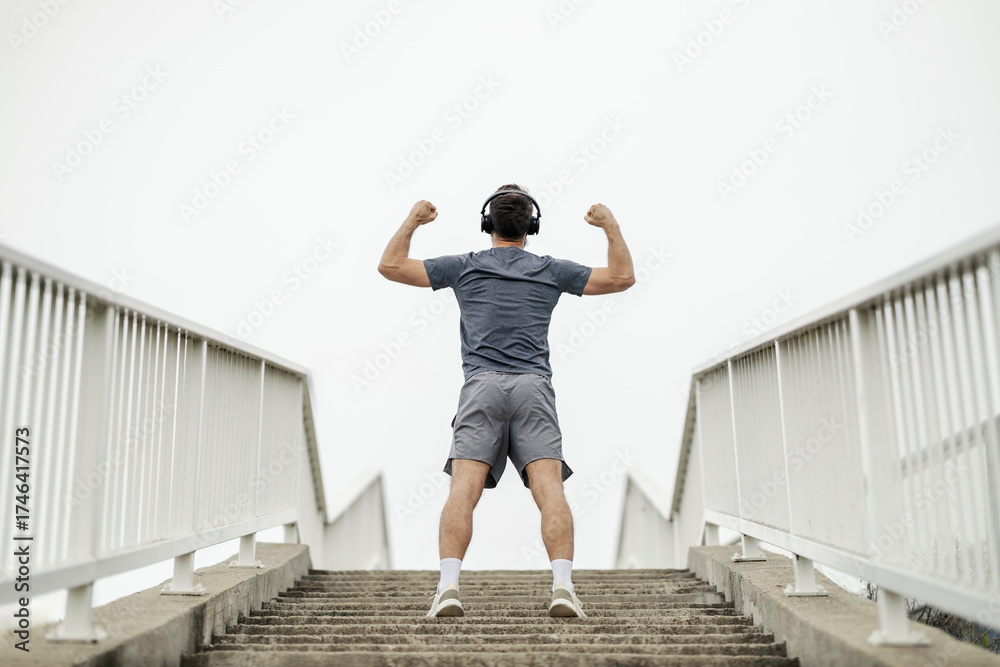 Male Athlete Flexing on Outdoor Staircase Wearing Gray Sportswear and Headphones