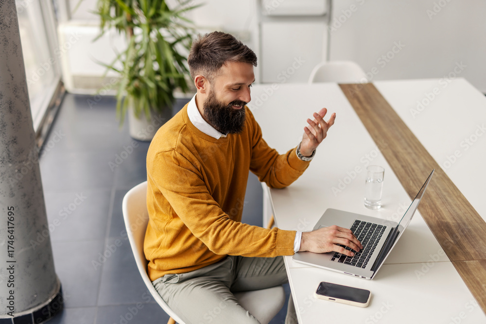 Confident Businessman in Yellow Sweater Engaging in Video Call in Modern Office