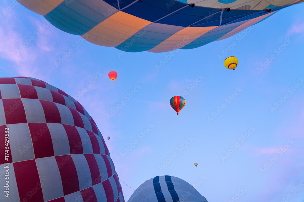 Hot air balloons ascend into the sky during a sunrise in Turkey