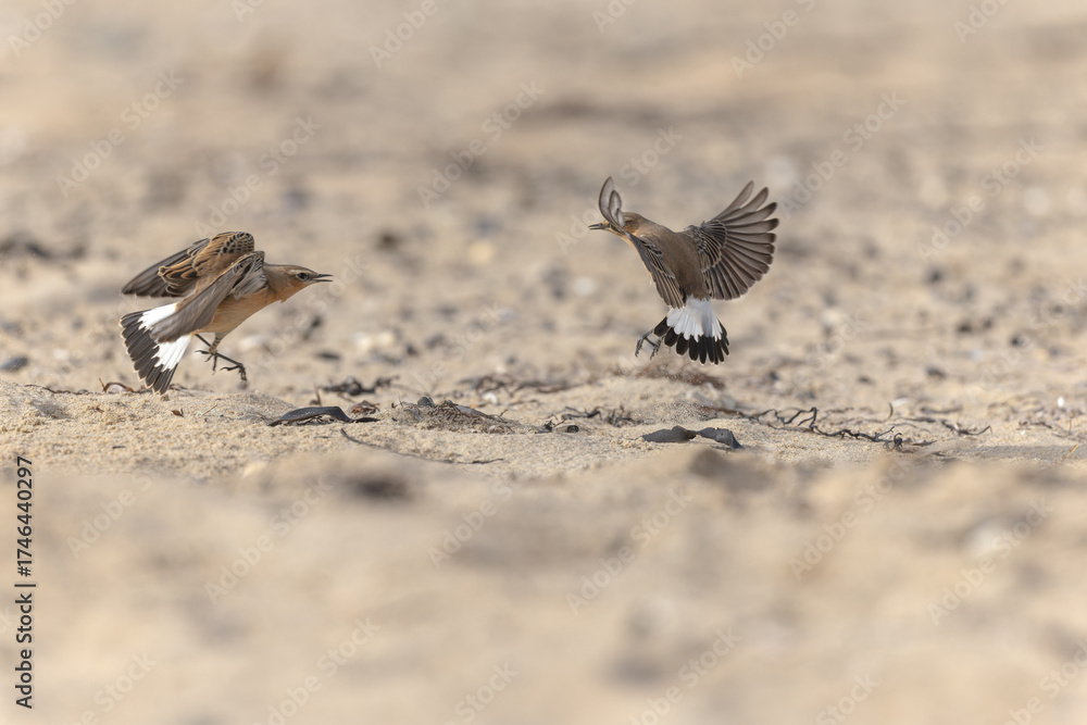 European Wheatear Oenanthe oenanthe on a sandy beach in Normandy, Channel Coast, France
