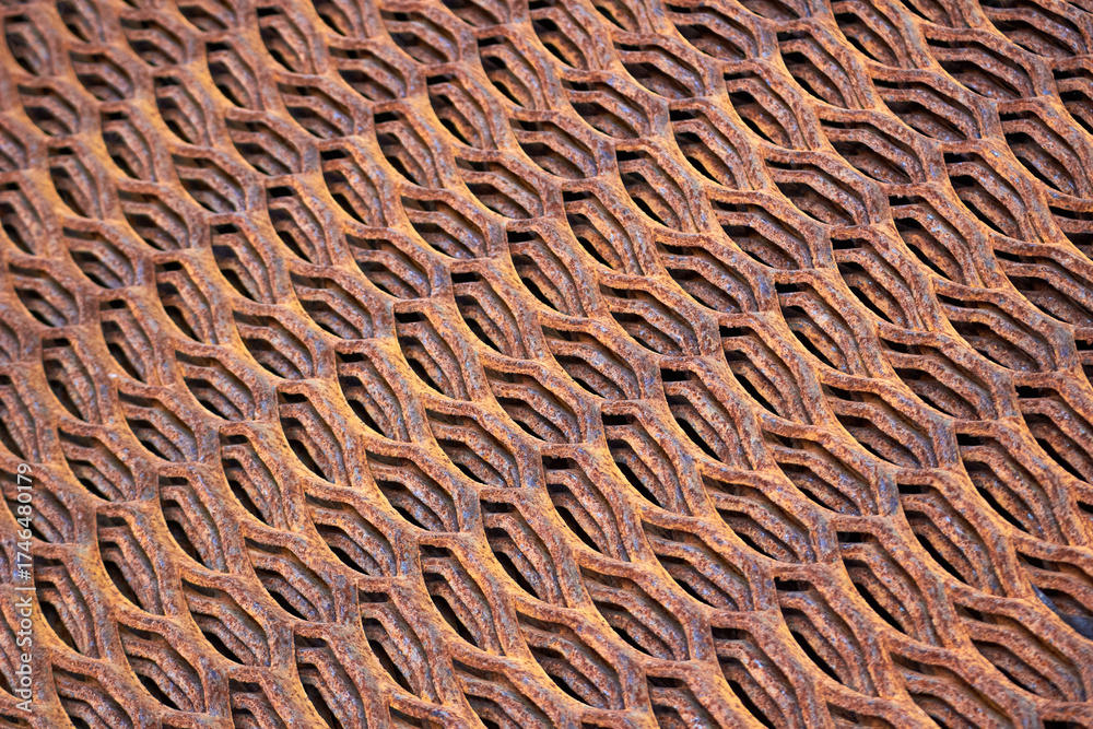 Perforated rusty metal floor sheet stamping plates texture closeup angled view. Metal stamping sheet metal manufacturing lightweight bearing flooring elements structural combine strength functionality