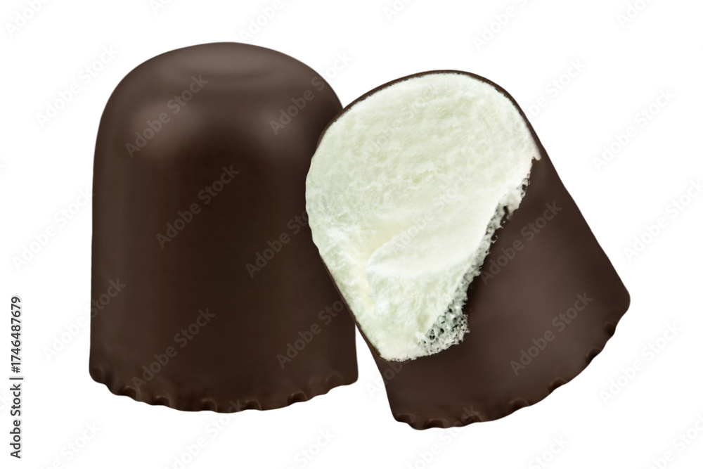 Two chocolate-covered cakes with foamy sugar isolated on white background