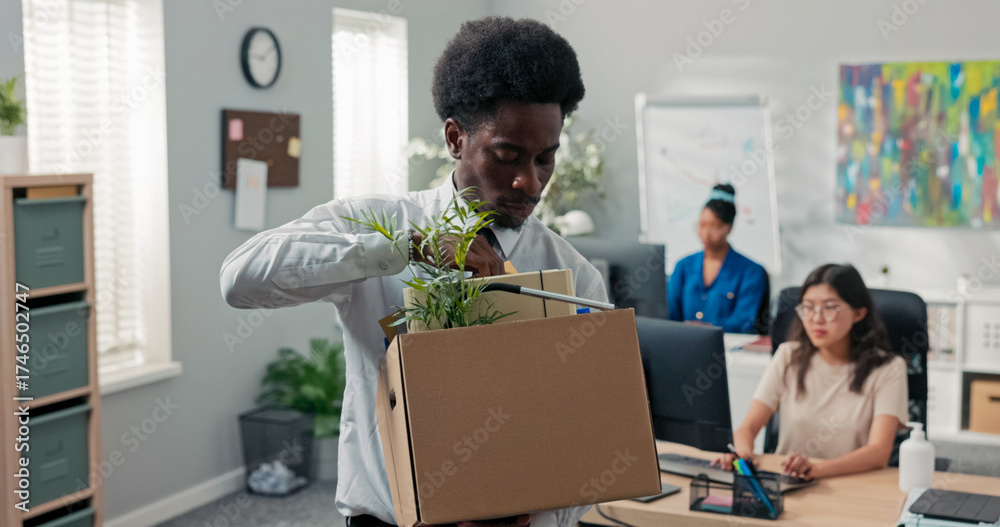 A man quits his corporate job, leaving the office with a packed box of belongings. He pauses at the door, checking to make sure he took everything, smiling happily as he retires.