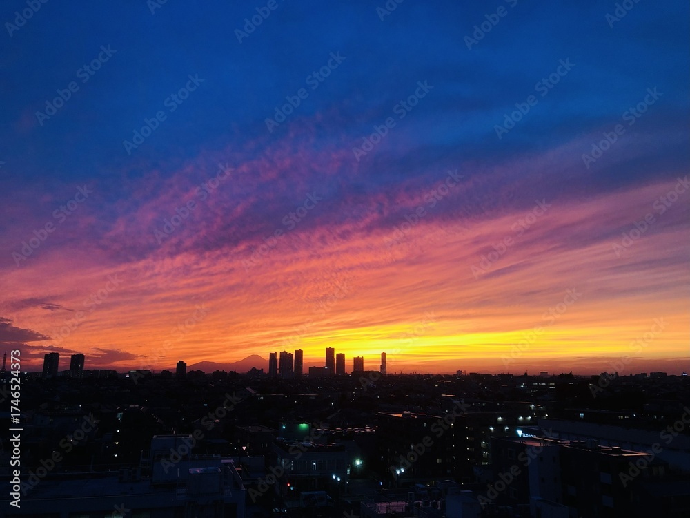 色のコントラストが鮮やかな夕焼け 高層ビルと富士山