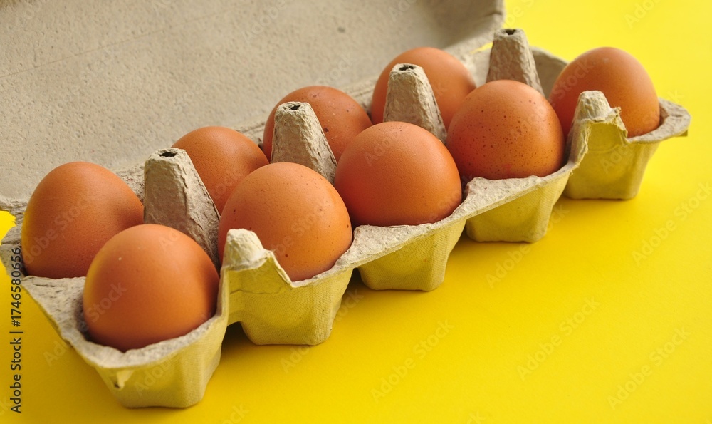 Brown eggs in a cardboard box on a yellow background. Chicken eggs in a tray close-up. Sustainable packaging, fragile packaging. Omega-3 fatty acids, protein source, everyday food, healthy lifestyle,