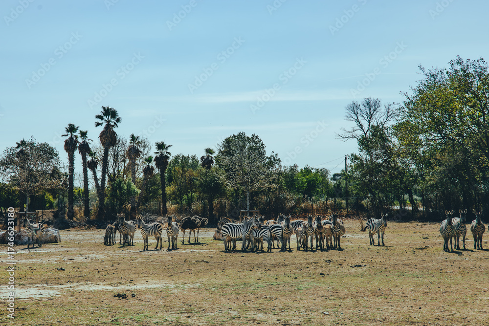 Group of zebras standing on dry savannah with palm trees and forest in background. Wildlife safari scene showcasing African animals in natural open habitat under blue sky