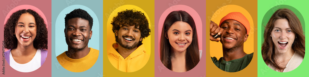 A group of six young adults is smiling in a fun collage. Each person shows joy and happiness, with unique backgrounds that add color. The setting showcases diversity and positive energy.