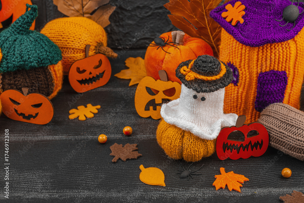 Cozy Halloween scene with cute ghost figurines in tiny hats. Handmade knitted autumn decor, pumpkins