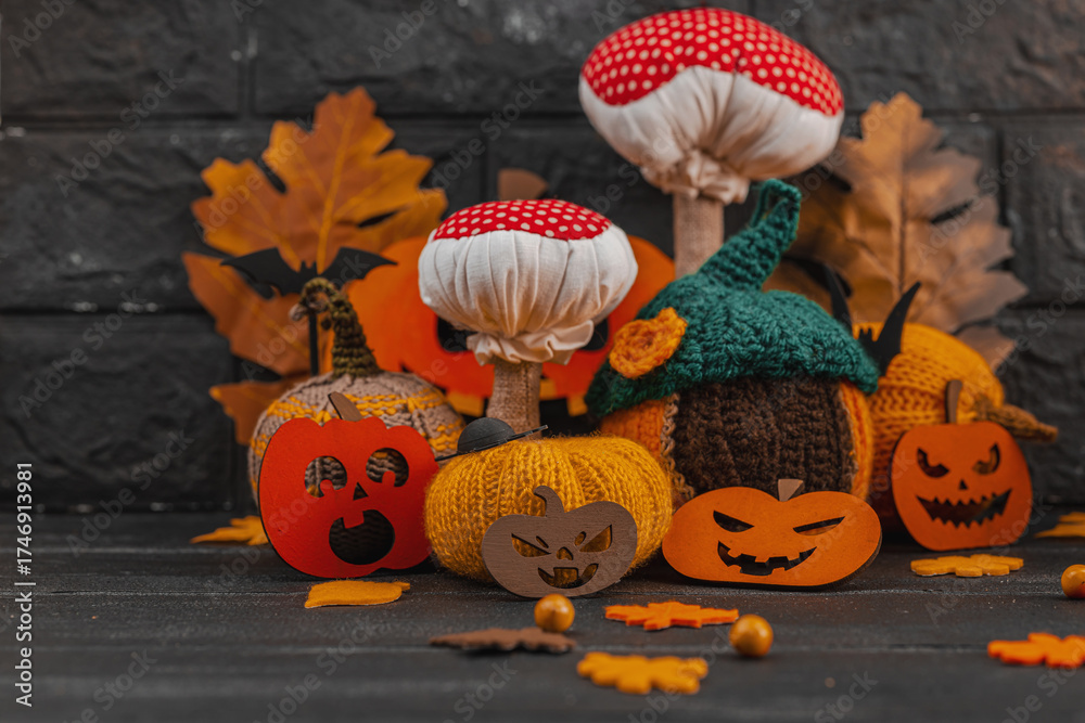 Dark Halloween atmospheric composition. Handmade knitted, crocheted, and sewn autumn decor