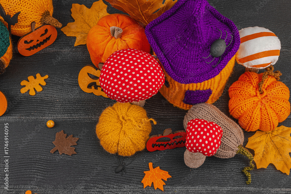 Dark Halloween atmospheric composition. Handmade knitted, crocheted, and sewn autumn decor