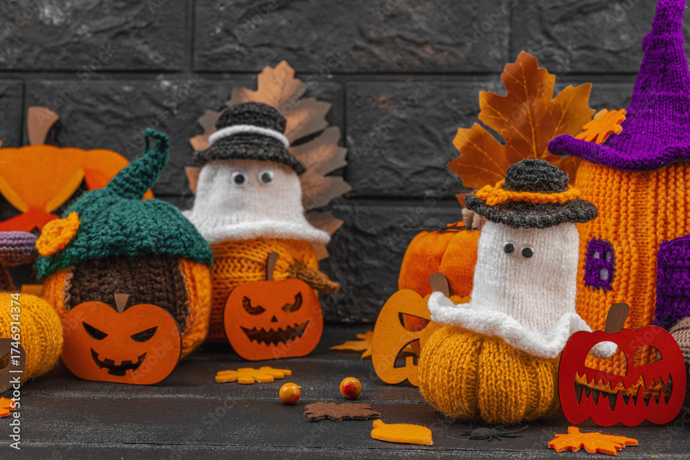 Cozy Halloween scene with cute ghost figurines in tiny hats. Handmade knitted autumn decor, pumpkins
