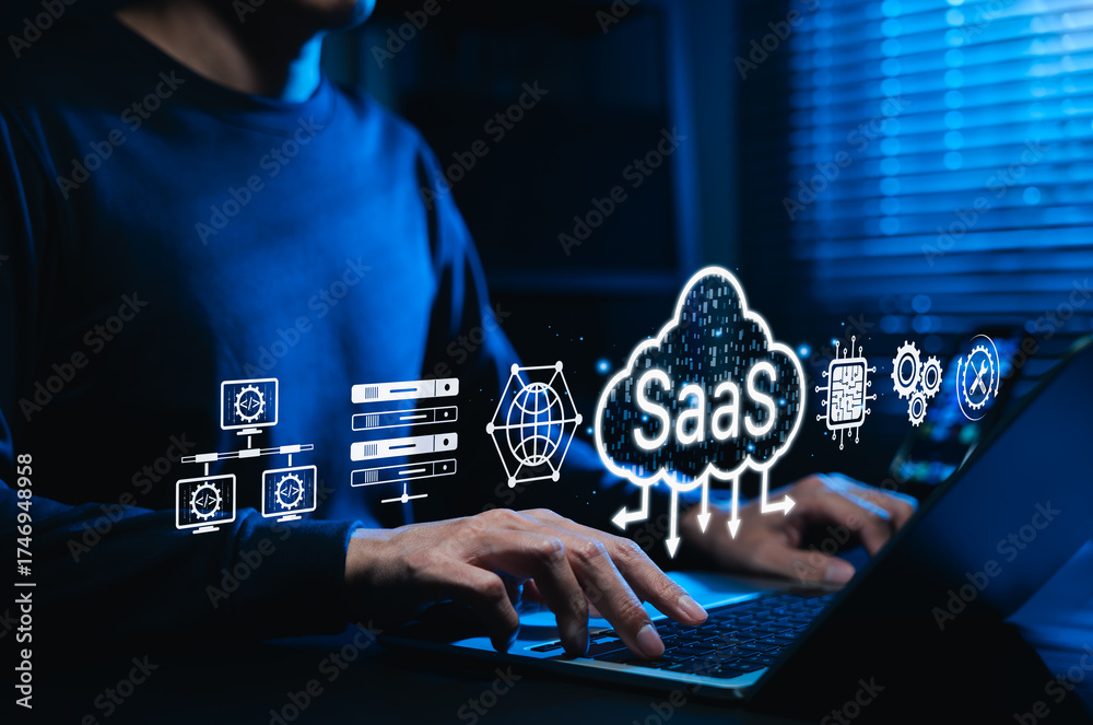 SaaS cloud computing and software service technology. Man using laptop with SaaS and cloud icon, represent Software as a Service, cloud infrastructure, data processing digital platform-based solutions