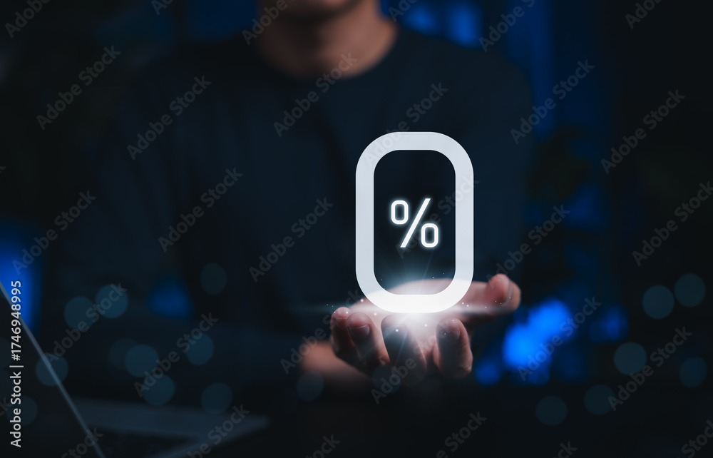 Zero percent interest concept. Man holding glowing 0% symbol in hand representing financial offer, campaign, loan promotion, or marketing deal with no interest rate for digital banking or fintech.