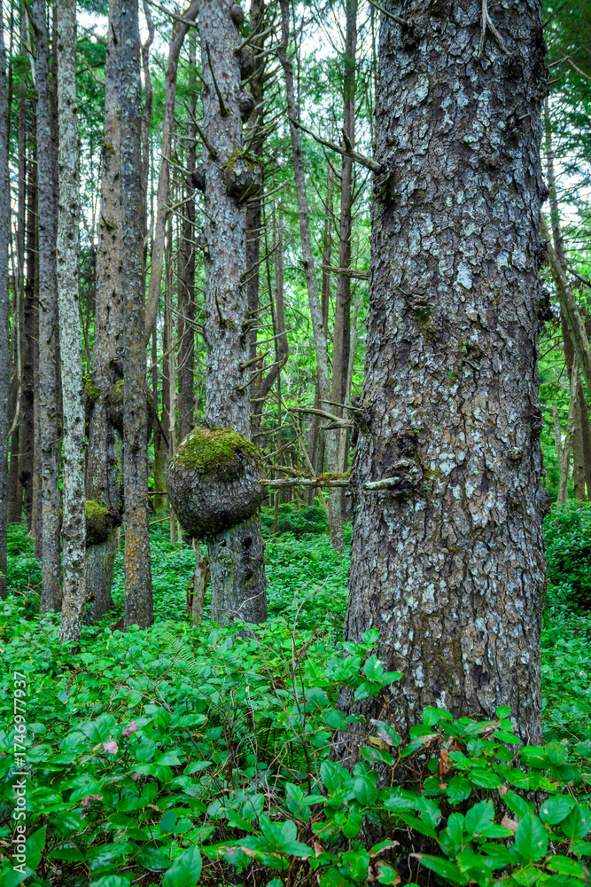 Burls, growths and epiphytes on conifer trunks in a damp forest, Olympic National Park