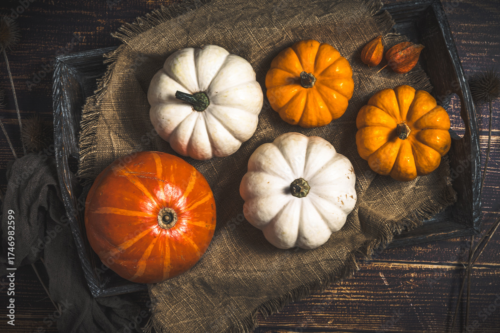 Autumnal decoration with various edible pumpkins on dark wooden background