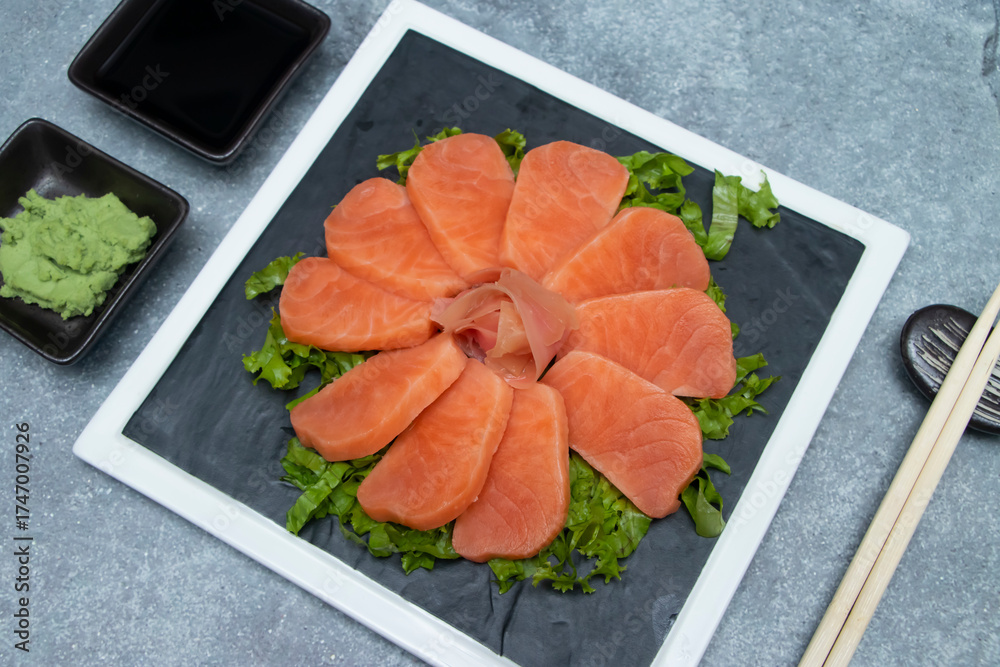 Salmon Sashimi on Slate with Wasabi, Ginger, and Soy Sauce top view of japanese food