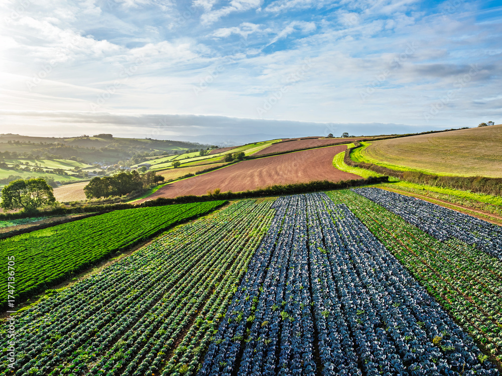Farms and Fields at evening sun from a drone, Shaldon, Devon, England