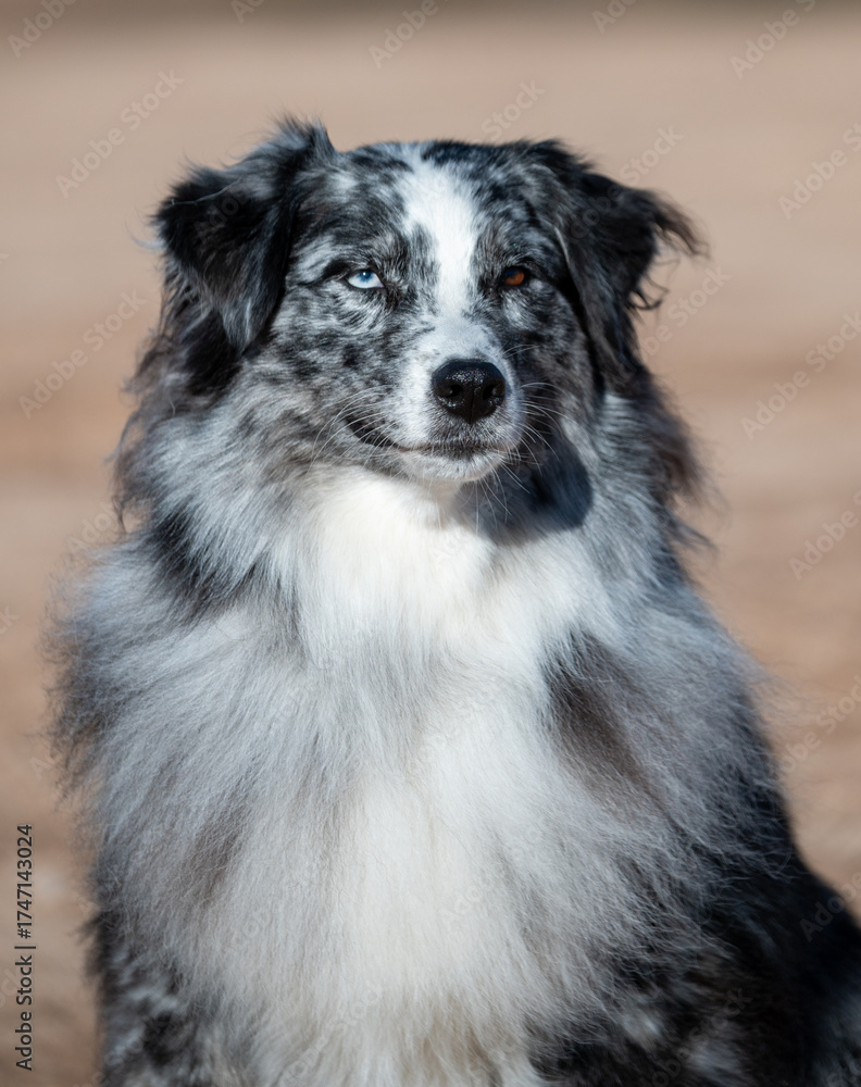 Outdoor head shot portrait of an Australian Shepherd