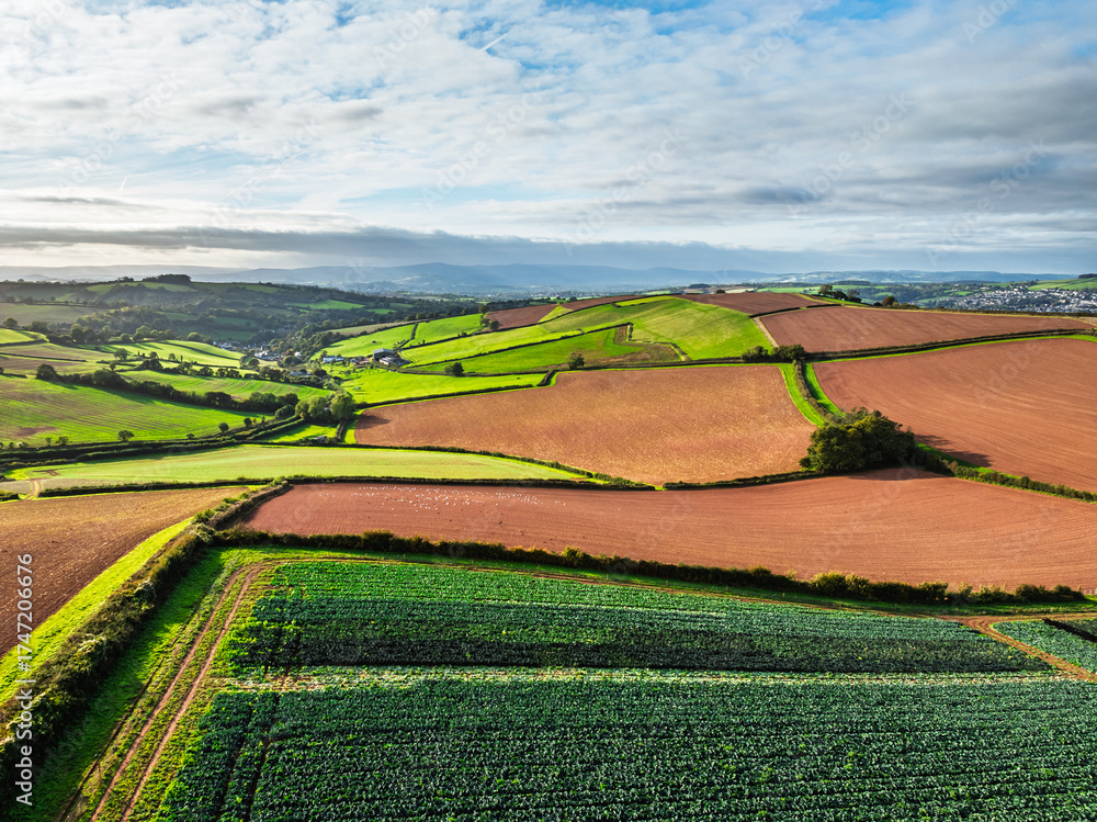 Farms and Fields at evening sun from a drone, Shaldon, Devon, England