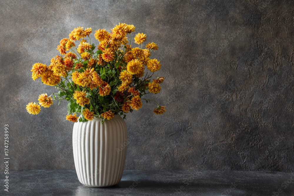 Autumn yellow and orange chrysanthemums flowers in white vase on dark background. Minimal modern composition. Season decoration. Home interior.