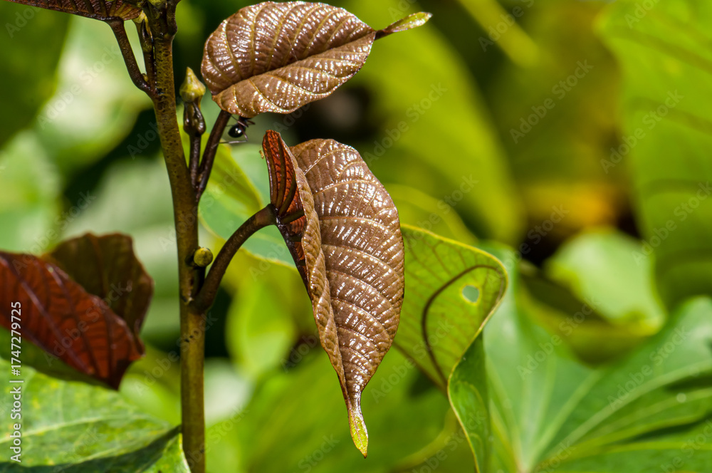 Close-up of young bronze-colored tropical leaves with glossy texture and sunlight reflections in green jungle background