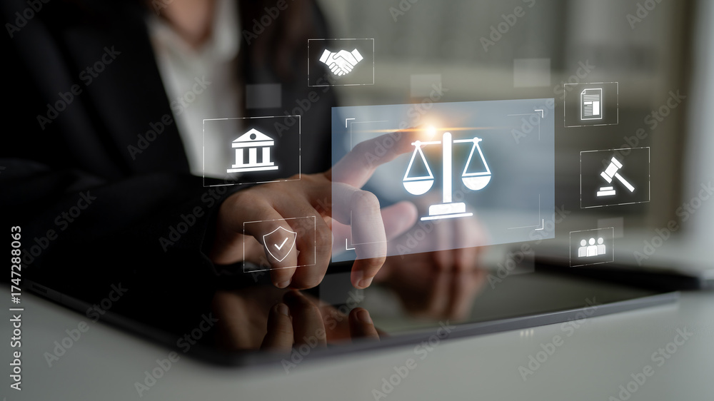 Legal compliance and governance concept showing justice scale, courthouse, contract, policy, agreement, rule, and protection of rights in legal or business environment Latch