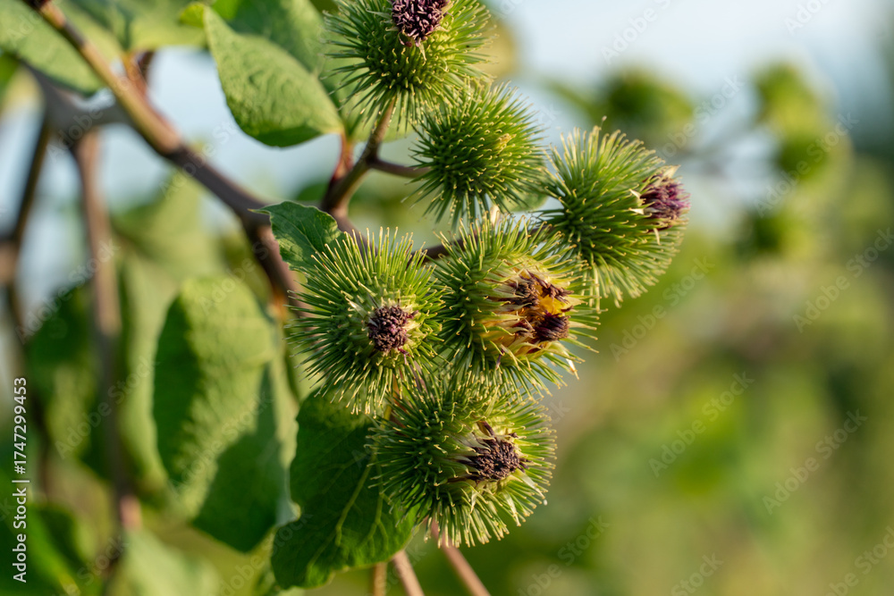 Clustered green burdock seed heads with developing purple flowers on a wild plant branch outdoors