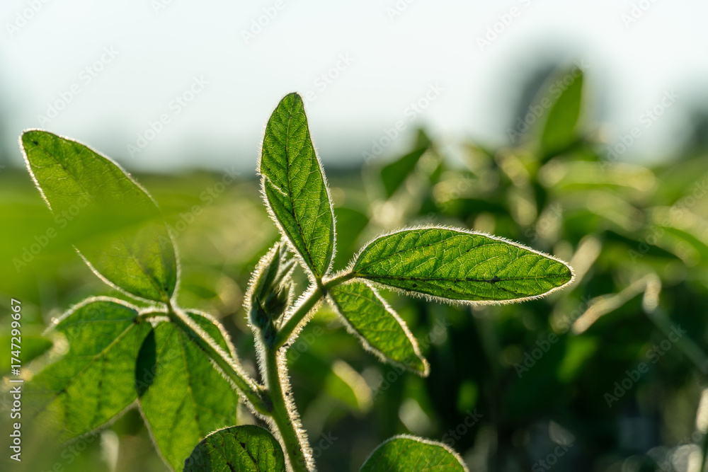 Vibrant green leaves of a young crop plant glowing in soft sunlight at golden hour with fuzzy textures