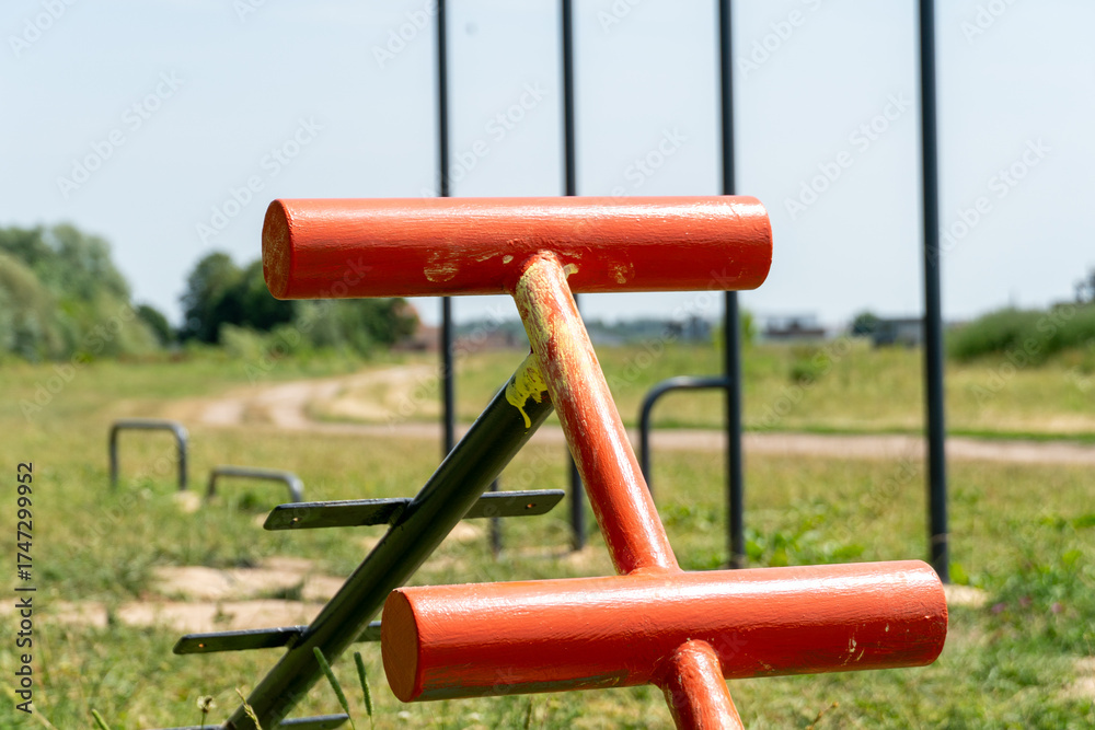 Close up of weathered red outdoor fitness equipment in a green grassy field on a bright day