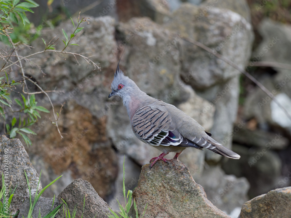 Crested Pigeon (Ocyphaps lophotes) standing in a rock garden