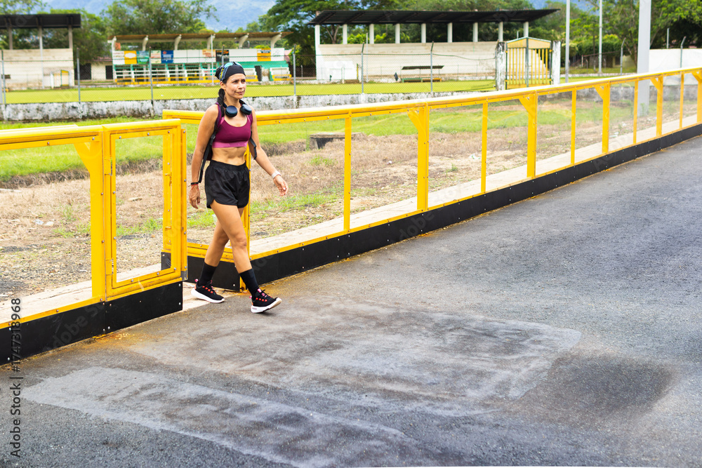 Dedicated woman arriving for her fitness workout on an outdoor track. Reflecting a disciplined lifestyle focused on health and athletic commitment.