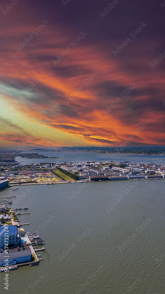 Aerial shot of hotels and condos and blue ocean water in Ocean City Maryland USA