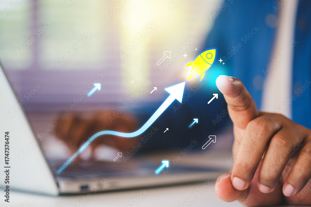 Business growth to target. Startup new project. Rocket launching from laptop to target. Represent strategic planning, Goal setting. Investment management. Company strategy. Business vision