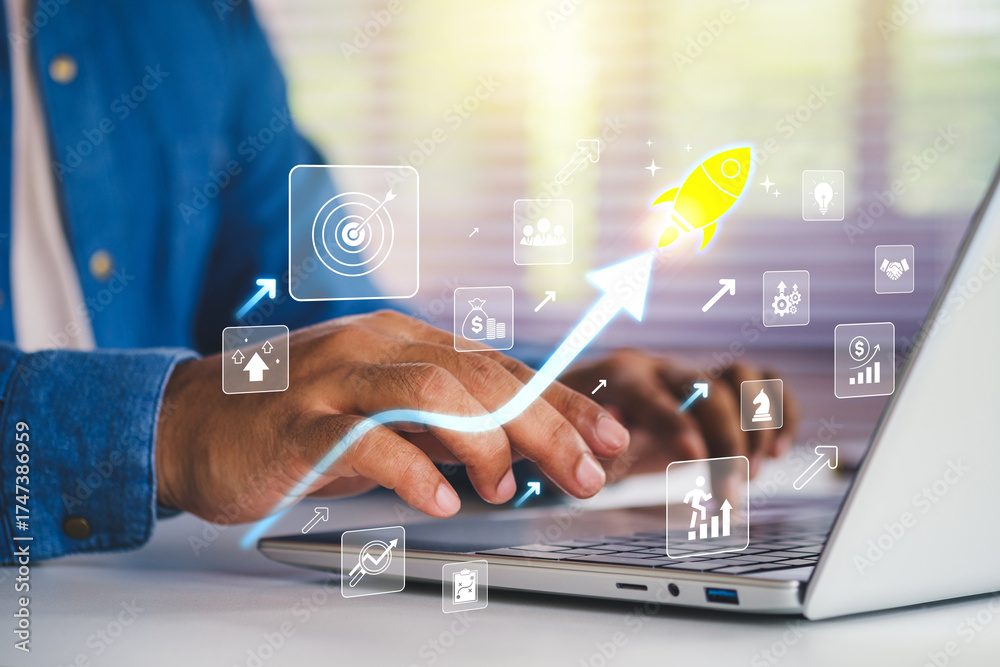 Business growth to target. Startup new project. Rocket launching from laptop to business icon. Represent strategic planning, Goal setting. Investment management. Company strategy. Business vision
