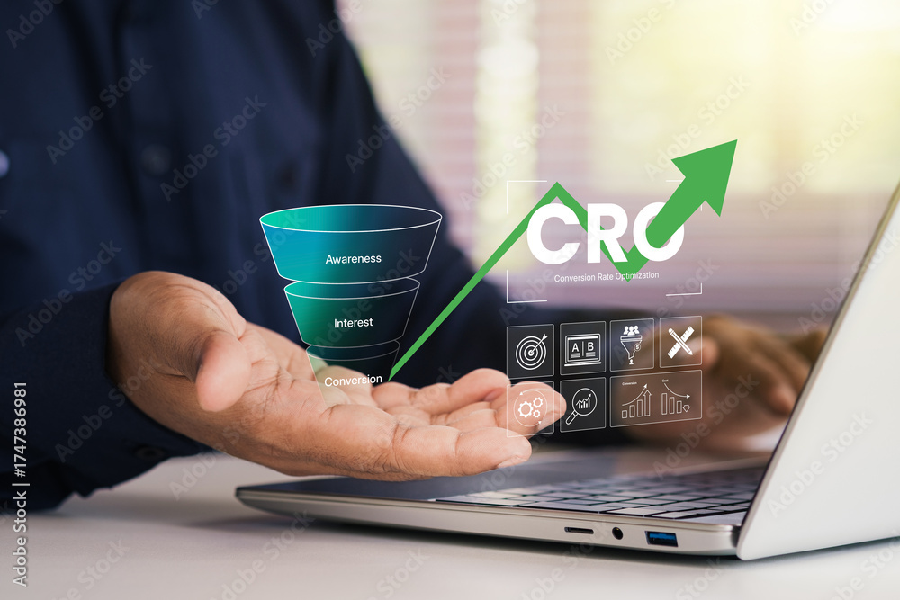 Conversion Rate Optimization, CRO success strategy, digital marketing funnel awareness interest conversion stages, business performance improvement, ROI growth, customer journey metrics visualization