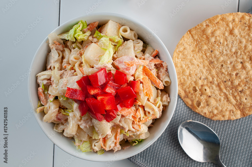 Ensalada de atun con pasta y pimientos rojos encima, vista aerea flat lay o top view