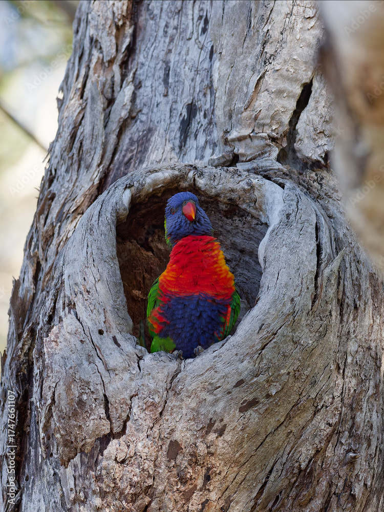 Rainbow Lorikeet (Trichoglossus moluccanus) at nest in tree hollow.