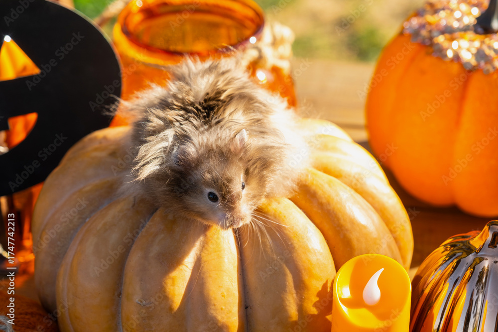 A funny shaggy fluffy hamster sits outdoor on a pumpkin in a Halloween decor among garlands, lanterns, candles. Harvest Festival