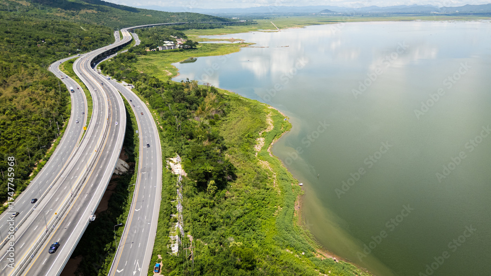 Drone shot The M6 motorway Nakhon Ratchasima Province - Bang Pa-in Lam Ta Khong River and Mountain. Motorway Korat Thailand