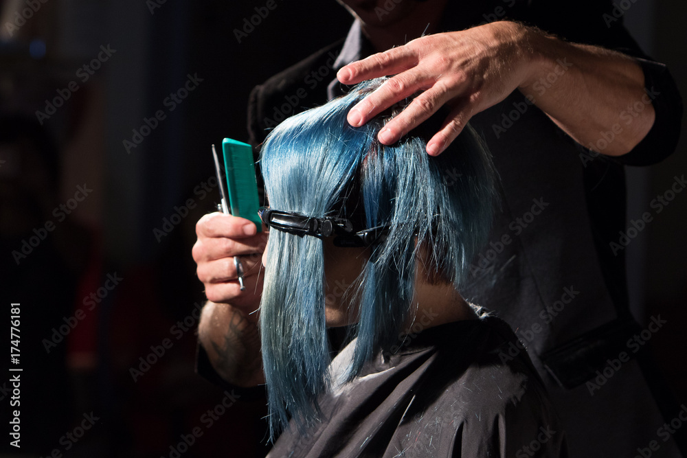 Hairdresser at work on blue hair color