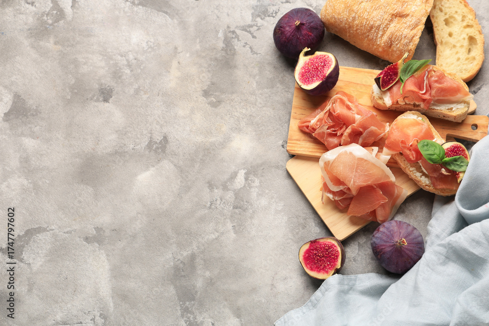 Wooden board of bread slices with delicious prosciutto and fresh fig on grey background