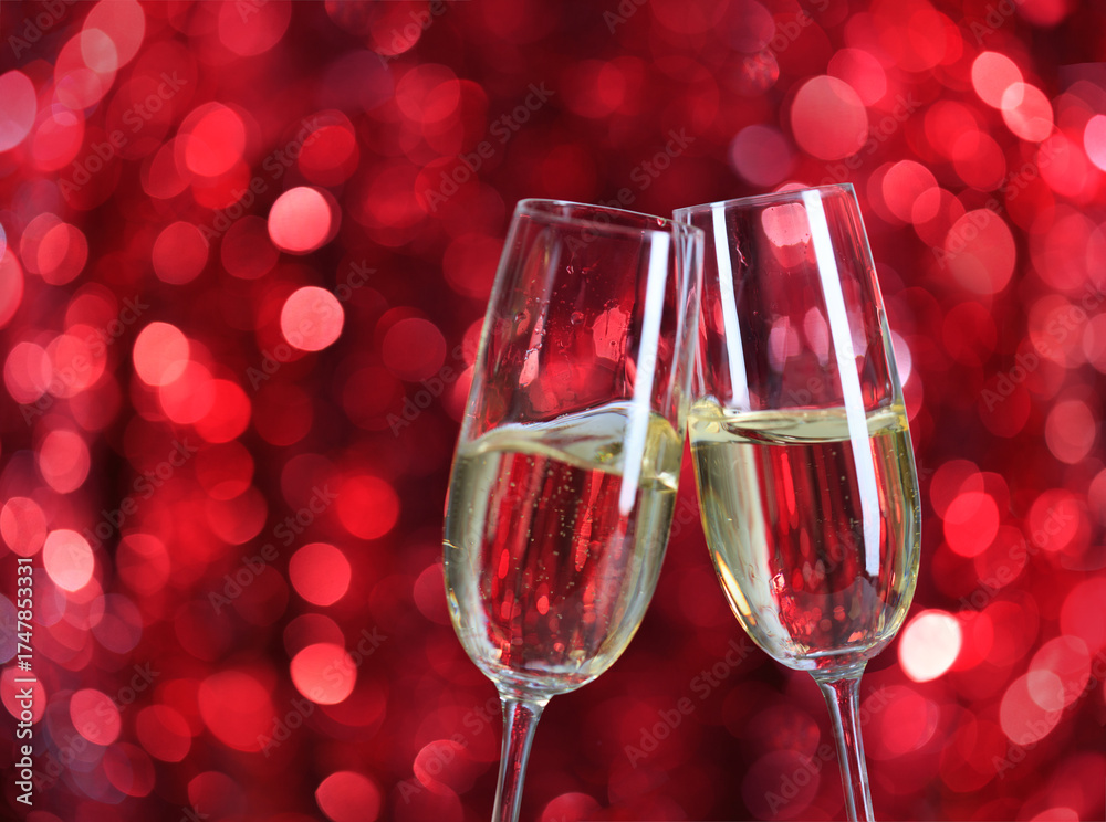 Close-up of two champagne glasses clinking together against a red glitter background.