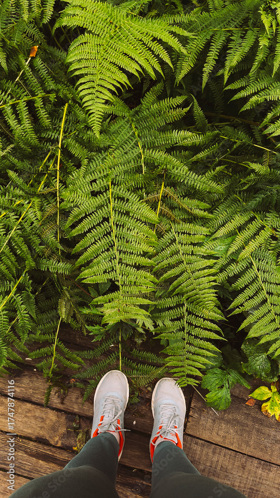 A pair of white sneakers on a wooden path surrounded by lush green ferns.