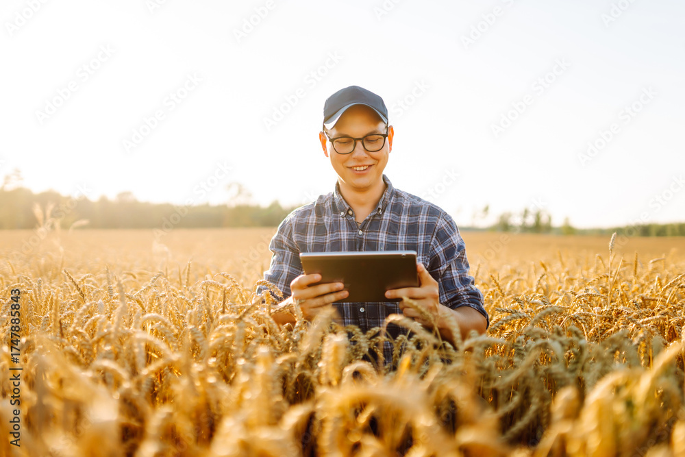 A young farmer in a checkered shirt with a digital tablet works in a field. An agronomist checks the quality and growth of the crop at sunset. Gardening concept, harvesting.