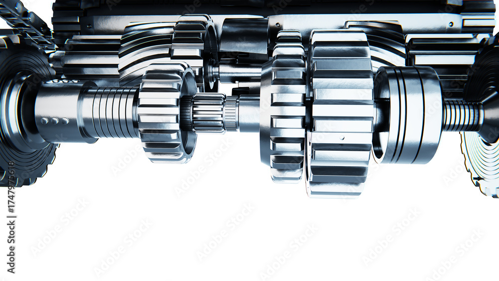 Detailed view of a mechanical gear system isolated on transparent white background.