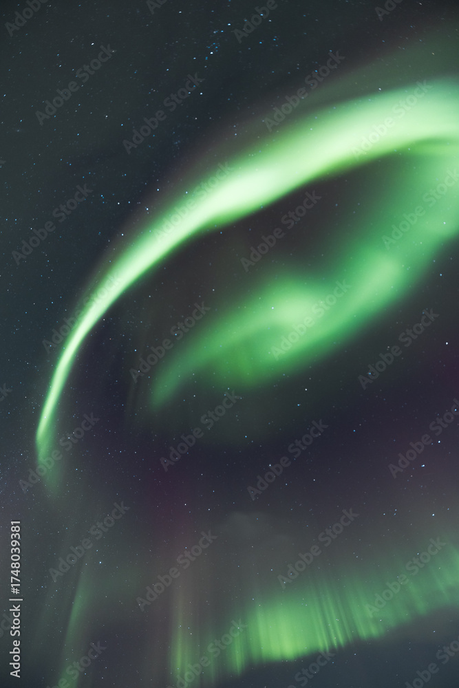 Magical Aurora Borealis in green, red, pink colours above Mortenhals with thousands of stars in the Troms region of Northern Norway