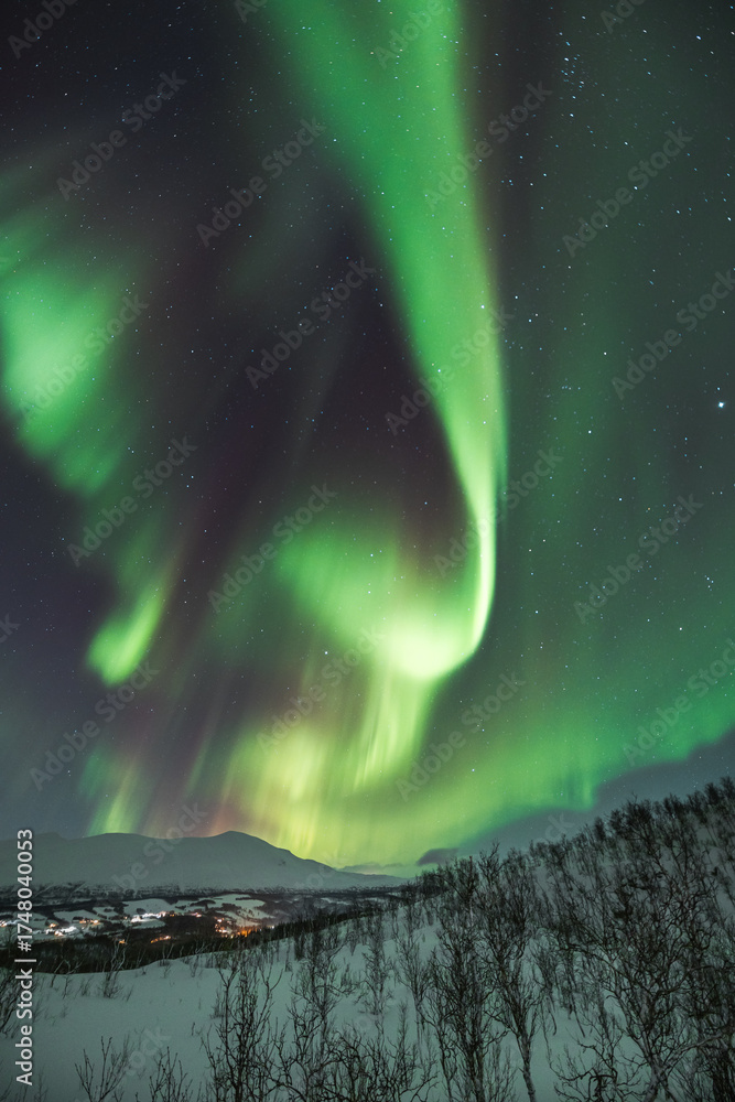 Magical Aurora Borealis in green, red, pink colours above Mortenhals with thousands of stars in the Troms region of Northern Norway